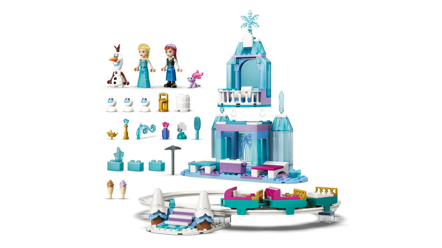 LOSS RAJA JA KELKUDEGA – See Elsa jäälossi ja lumesõidu seikluse (43281) mängukomplekt sisaldab 7 LEGO® ǀ Disney Frozen tegelast, kahekorruselist lossi, rada 3 kelguga, treppe ja muud