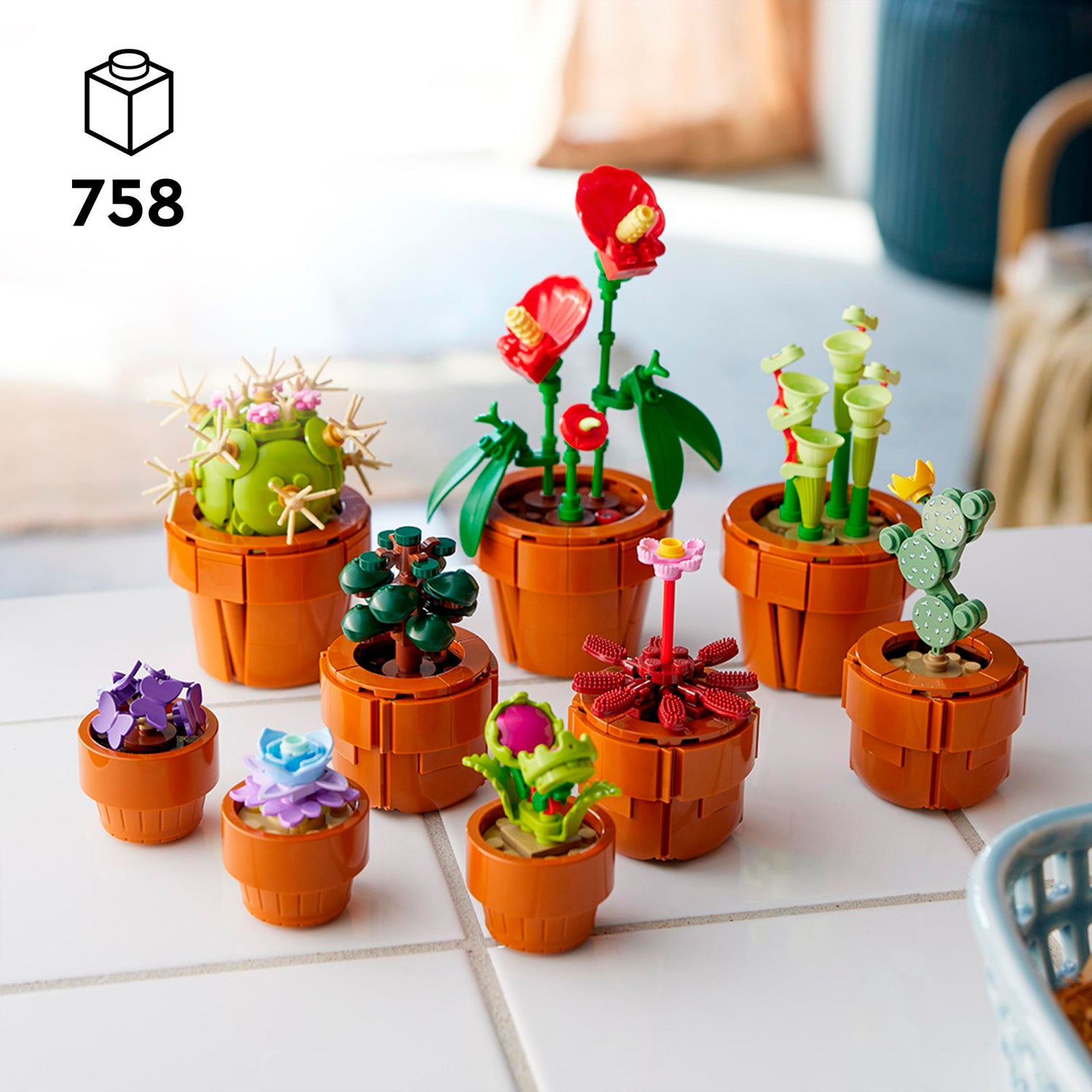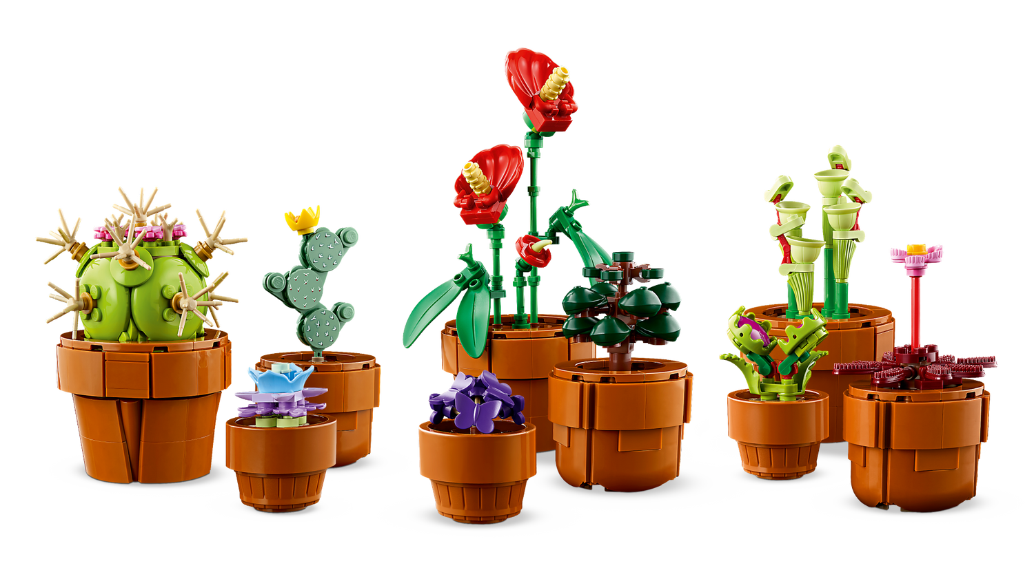 Loo oma kodu või kontori lauale 9 taimest koosnev elegantne lilleväljapanek LEGO Iconsi väikeste taimede täiskasvanutele mõeldud kodukaunistuse ehituskomplektiga.