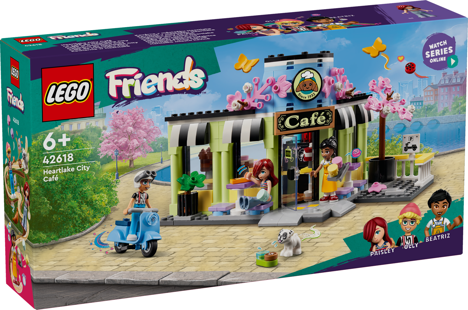 LEGO Friends Heartlake’i linna kohviku mänguasi (42618) sisaldab kondiitrikohvikut ning sellega on kaasas kolm mininukku ja koerafiguur.