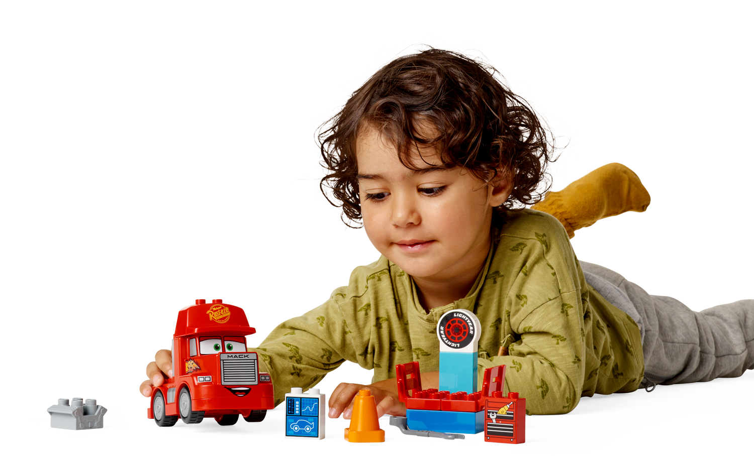 Väikelaste ehitusmänguasjal Mack võidusõidul on kuulus suur punane veoauto ning see sisaldab kokkupandavat garaaži, mutrivõtit ja eemaldatavat mootorit.
