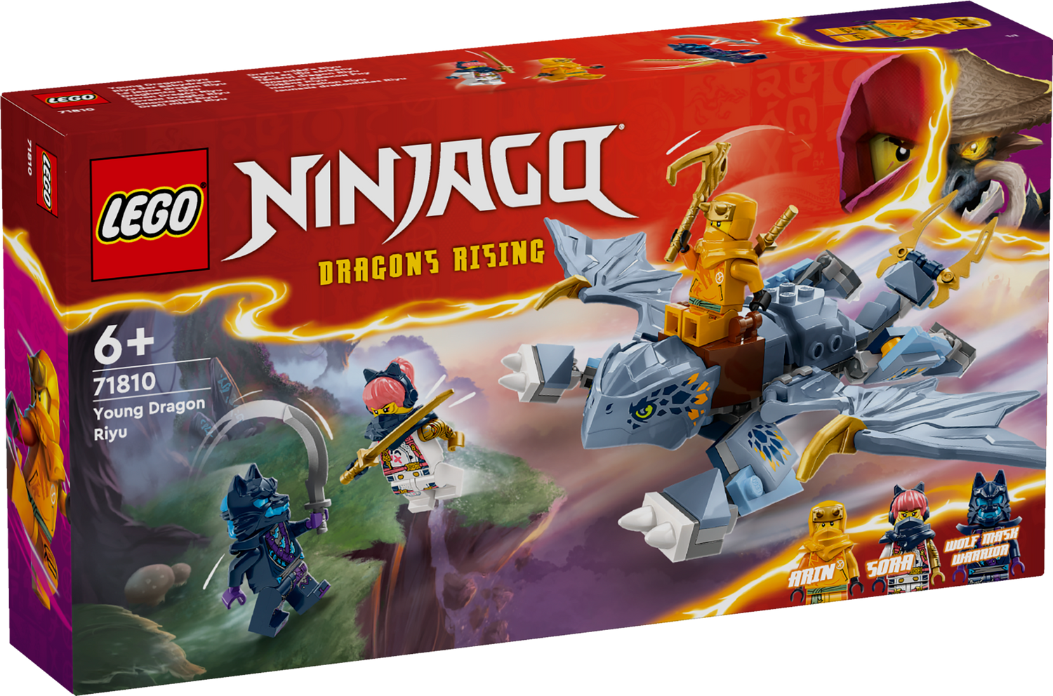 LEGO NINJAGO tegevusmänguasi koos liigutatava noore draakoni Riyu mudeli ning NINJAGO minifiguuride Sora, Arini ja Hundimaskis sõdalasega.
