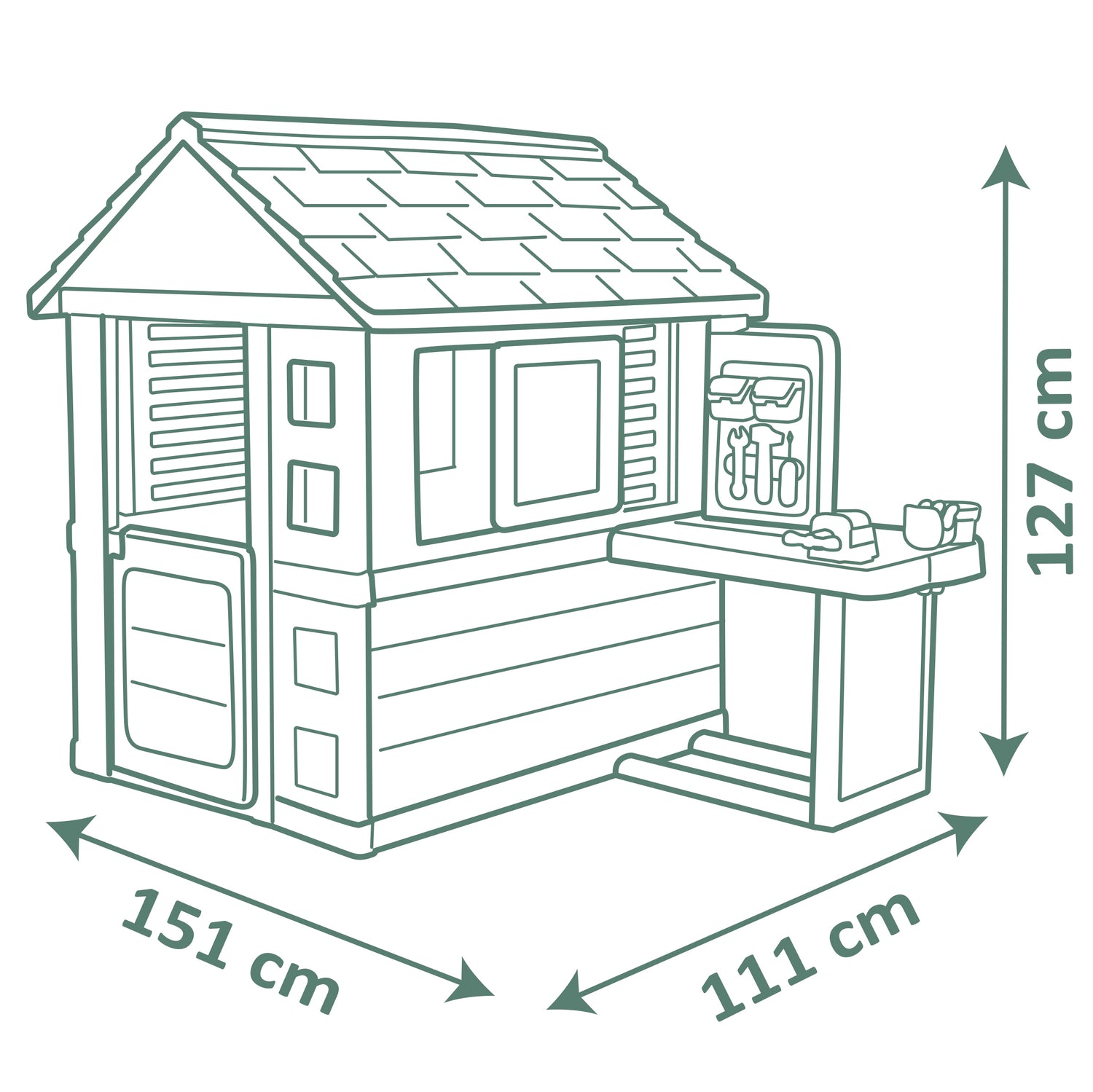 Täiuslik mängumaja koos töökojaga, mis muudab õueala loovaks ja aktiivseks mängupaigaks.