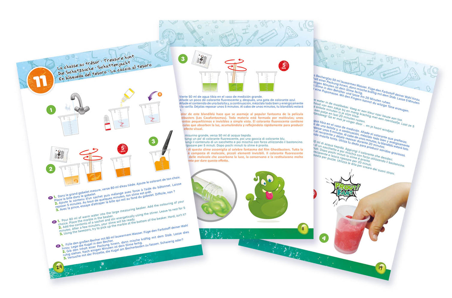 Pakendis on: 15 pakki limapulbrit, 5 pakki ultralima limapulbrit, 3 värvi (sinine, punane, kollane), 2 sädelust (kuldne ja sinine), 2 mõõdutopsi (50ml ja 100ml), 1 mõõdulusikas, 1 pipett, pintsetid, 1 ümar vorm, 1 õhupall, 1 lehter, 1 kuul, 1 katseklaas koos alusega, 1 purk pimedas helendavat pulbrit, 1 pudel fluorestseeruvat värvi, 3 segamispulka, 4 hoiupurki, kaltsiumlaktaat, naatriumalginaat ja juhend.