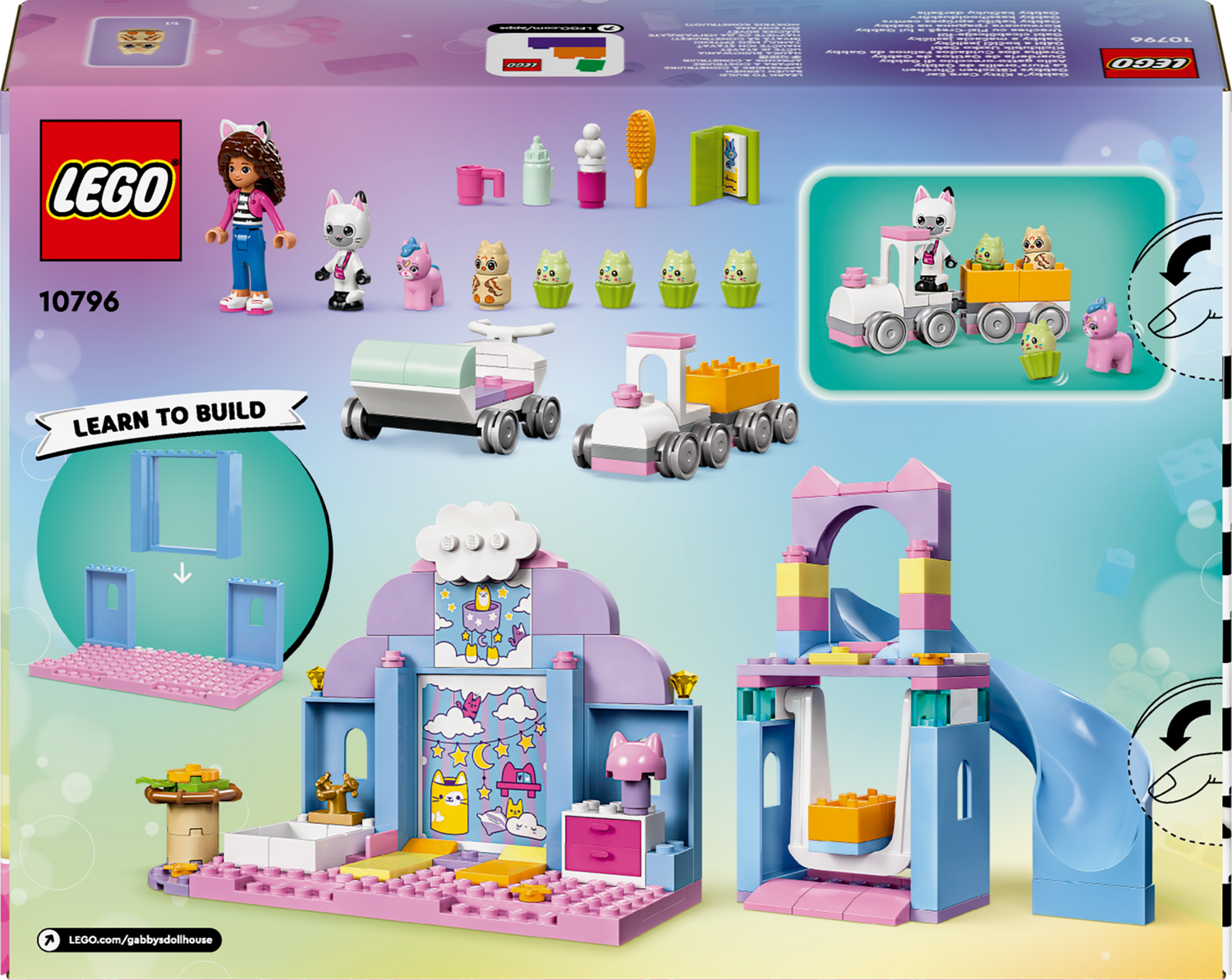 Mängukomplekt Gabby kassikeste päevahoid sisaldab mängurongi ja muid detaile, et pakkuda lõputuid rollimänguvõimalusi alates 4-aastastele DreamWorks Animationi sarja "Gabby nukumaja" fännidele.